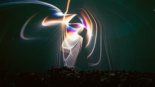 In einer außergewöhnlichen Fulldome-Performance verweben die französische Komponistin Flore und der Videokünstler Yannick Moréteau elektronische Beats mit hypnotischen 3D-Bildern.